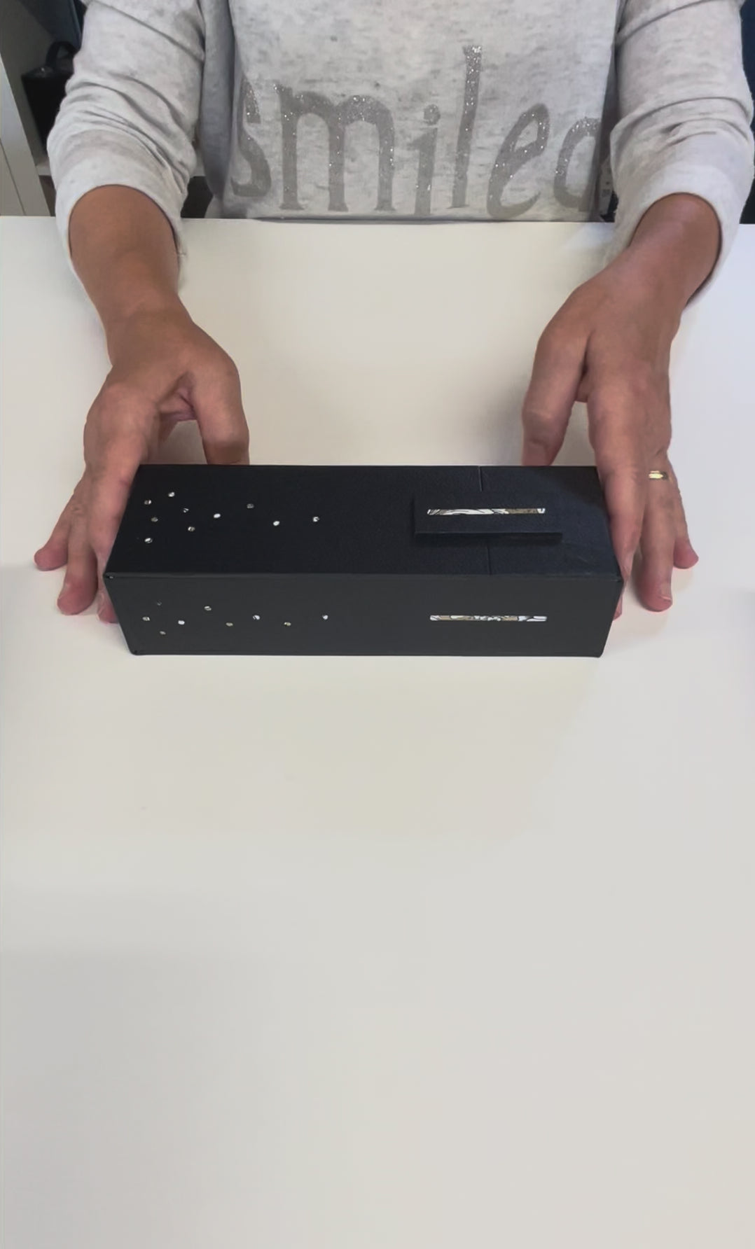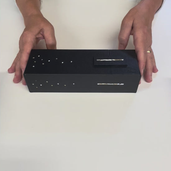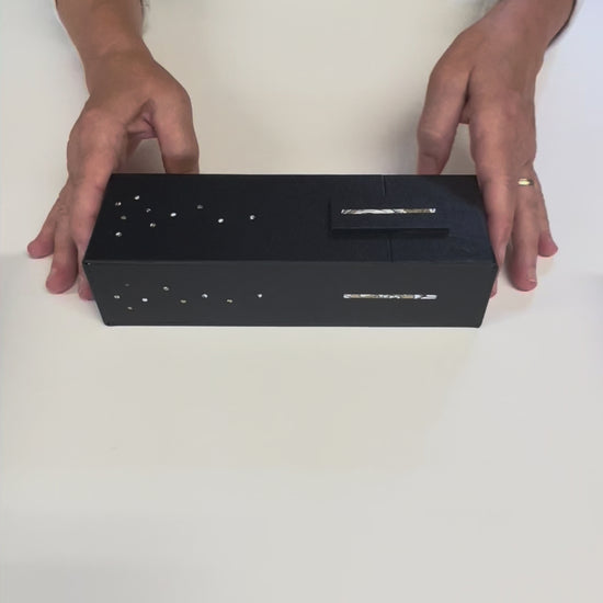 La boite de rangement, est composée d'une base et d'une 'chemise' qui englobe la base, et assure la fermeture grâce aux aimants.