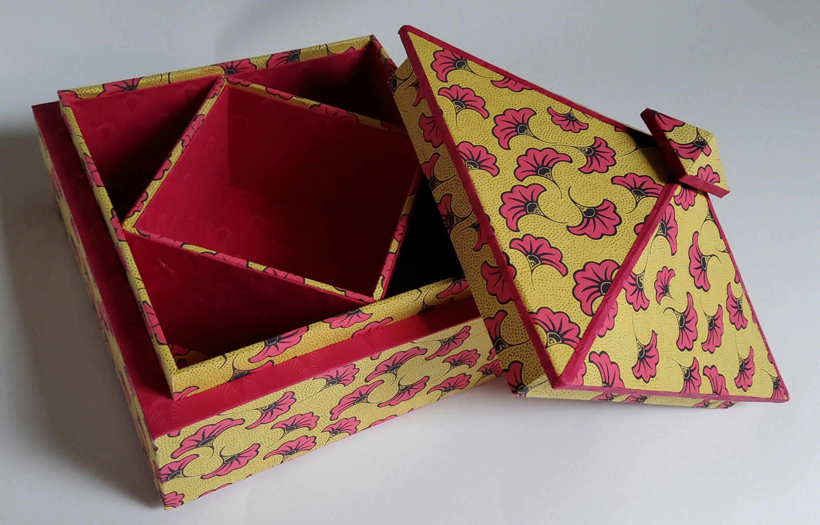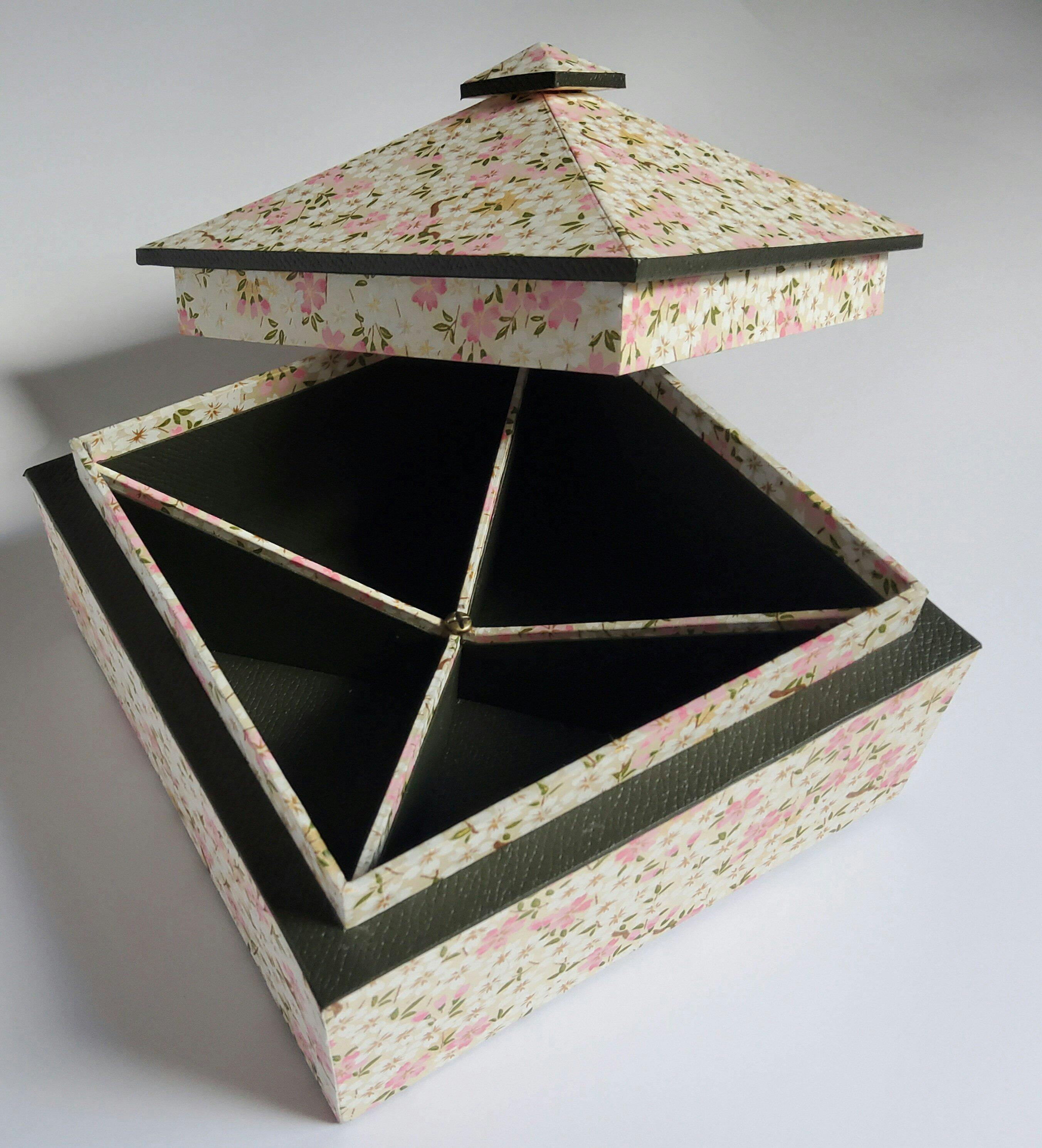Cette boite est composée d'une base carrée, avec des parois très épaisses, d'un couvercle en forme de pyramide amovible. 3 variations de rangements intérieurs sont proposés et expliqués.