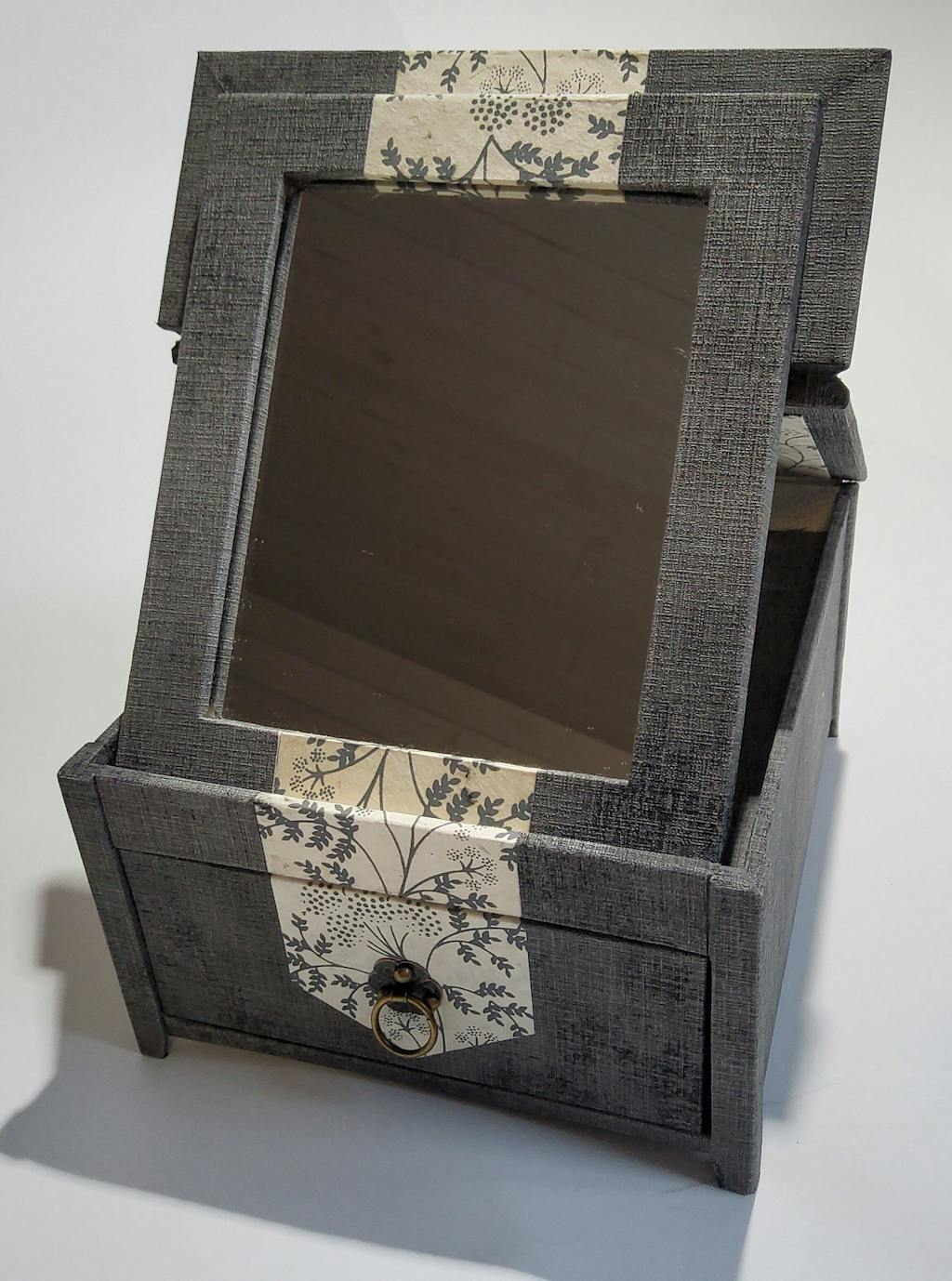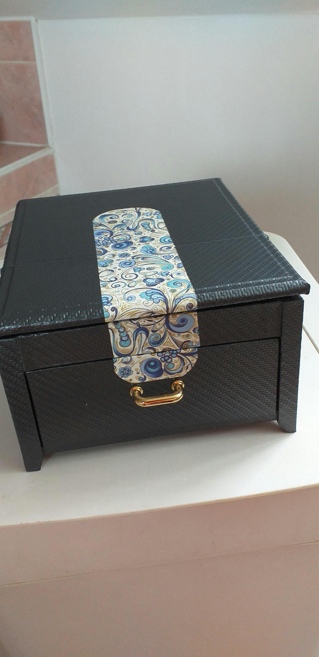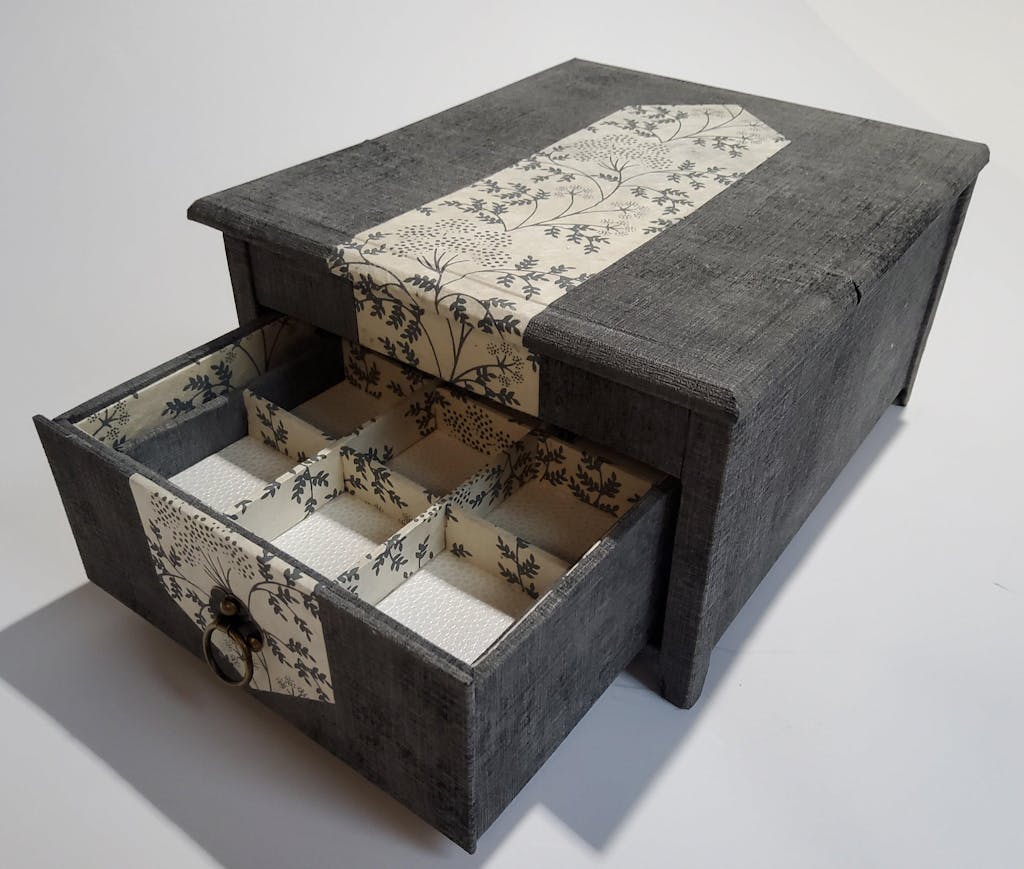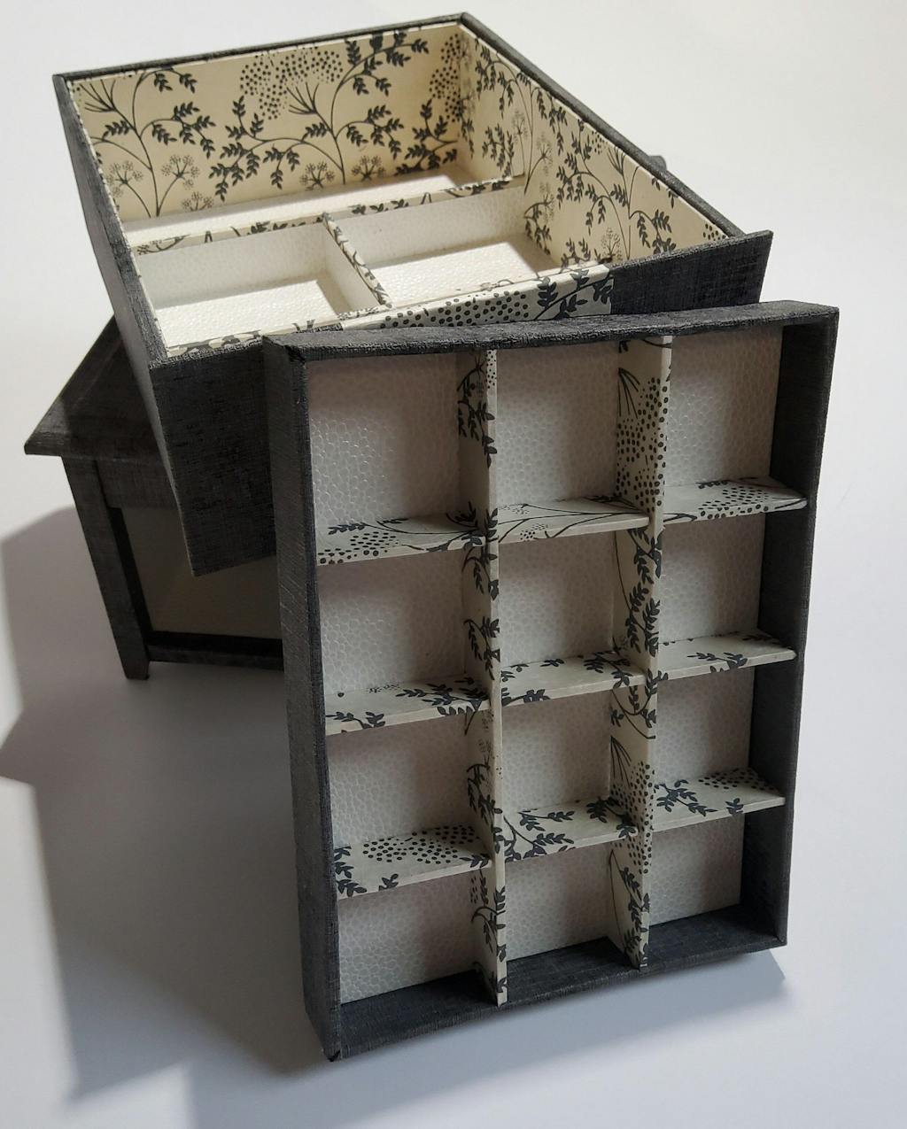 "Pas de cartonnage sans boite à bijoux bien sur. La mienne, je la voulais sobre et élégante, pratique. Challenge relevé.